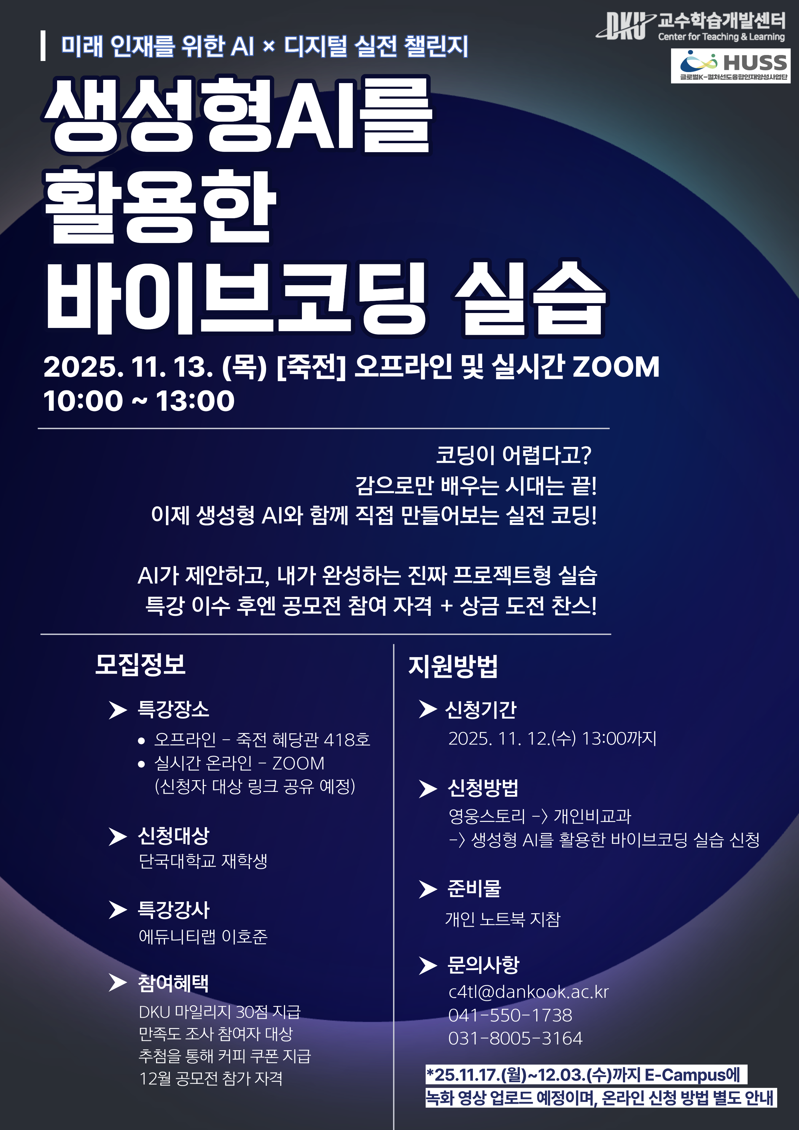 | [교수학습개발센터] 2025-2 실습형 학습법특강 「생성형 AI 를 활용한 바이브코딩 실습」 안내 | |
