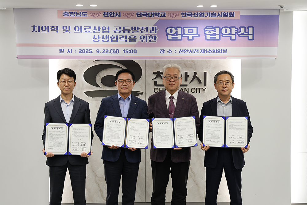 우리 대학이 국립치의학연구원 천안시 유치를 위한 기반 마련에 적극 나섰다. 지난 22일(월) 천안시청 소회의실에서 열린 협약식에서 우리 대학은 △천안시 △충청남도 △한국산업기술시험원(KTL)과 함께 치의학 및 의료산업 발전과 협력을 위한 업무협약을 체결했다. |