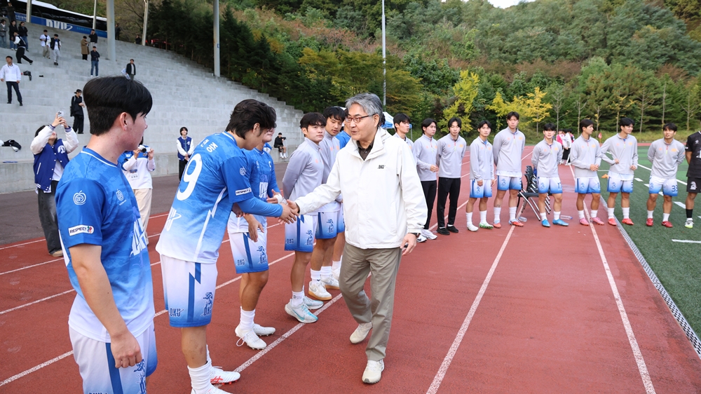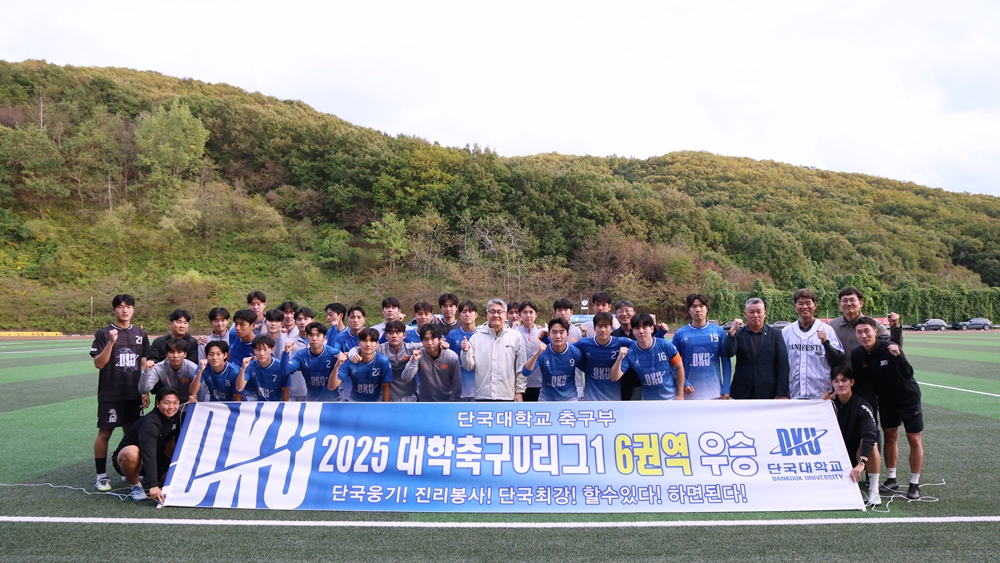 24일(금) 죽전캠퍼스서 열린 성균관대전 3-1 승리 올해 축구부는 추계대학축구연맹전 백두대간기 우승에 이어 1·2학년 대학축구연맹전 황가람기에서 창단이래 첫 우승을 차지하는 등 뚝심 있는 성과를 이어 나가고 있다. 경기는 인조잔디 전면교체로 최근 새 단장을 마친 죽전캠퍼스 대운동장에서 열렸다. 경기에는 안순철 총장을 비롯하여 대학 관계자와 학생들이 대거 응원에 나서 선수들에게 큰 힘을 보탰다. 경기는 성균관대가 1점을 선 득점하며 전반전을 마무리했지만, 후반전 우리 대학 이윤성의 선제골을 시작으로 김우진, 권병준이 차례로 추가 골을 터뜨리며 승부에 쐐기를 박았다. 이를 통해 우리 대학은 U리그 6권역 예선에서 7승 1무 1패를 거두며 남은 경기와 관계없이 1위를 차지했다. 박종관 감독은 “단국인의 응원 덕분에 U리그1 6권역 예선에서 값진 성과를 이룰 수 있게 됐다”라며 “대학 축구 U리그 정상에 당당히 설 수 있도록, 끝까지 선수들과 집중력을 잃지 않고 최선을 다하겠다”라고 밝혔다. 한편, 우리 대학 축구부는 △추계대학축구연맹전(2023, 2025) △춘계대학축구연맹전(2023) △U리그 왕중왕전(2022) △추계대학축구연맹전 백두대간기 우승(2025), △1·2학년 대학축구연맹전 황가람기 우승(2025) 등 굵직한 성과를 이어가며 대학 축구 강자의 위상을 굳건히 하고 있다. |