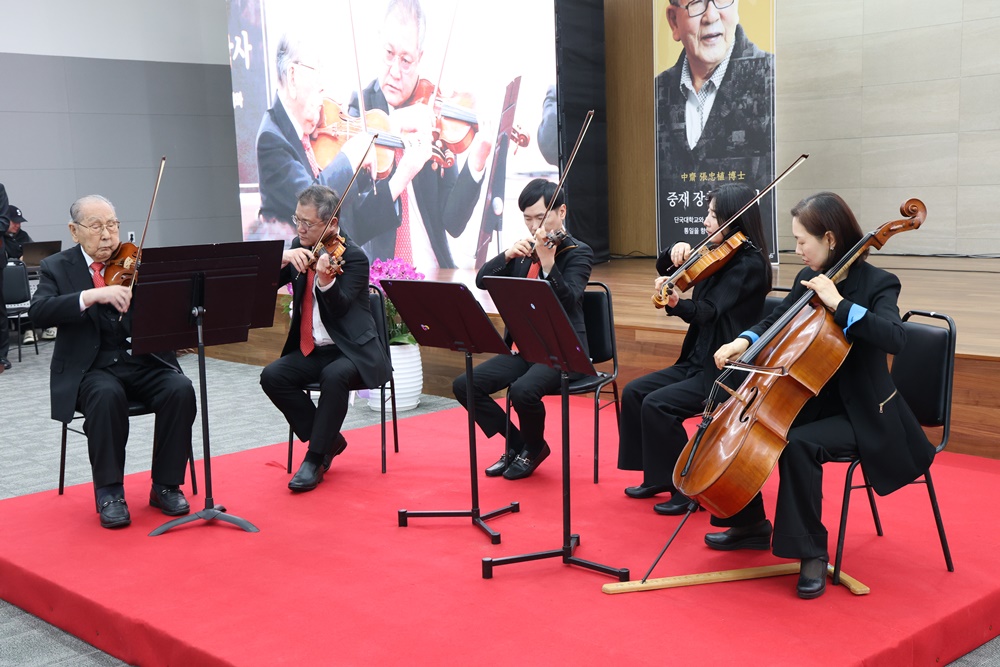 ▲장충식 명예이사장(왼쪽)이 아마레앙상블과 함께 바이올린 연주를 하고 있다.