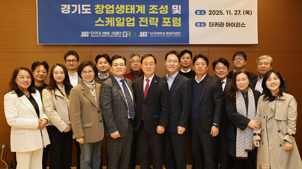“산·학·연·관 협력 기반 강화… 경기남부권 스케일업 생태계 전략 공유” 창업지원단·단국G-RISE사업단이 공동으로 27일(목) 경기도 성남시에서「제4회 경기도 창업생태계 조성 포럼 : Dankook Round」를 개최했다. 이번 포럼은 경기남부권 창업 및 중소기업 성장을 위해 산·학·연·관이 함께 정책을 공유하고, 지속 가능한 지역 창업 생태계 조성 방안을 모색하기 위해 마련됐다. 포럼에는 ▲경기도의회 미래과학협력위원회 ▲경기지방중소벤처기업청 ▲경기창조경제혁신센터 ▲경기도경제과학진흥원 등 창업지원 유관기관을 비롯해 우리 대학 창업보육센터 스타트업 대표들이 참석해 경기남부권 스케일업 생태계 강화를 위해 의견을 나눴다. 남정민 단장은 개회사를 통해 “우리 대학은 지역 창업기업의 스케일업을 위해 창업보육센터, 초기창업패키지사업단, 산학협력단, 단국G-라이즈사업단 등 캠퍼스 내 모든 창업지원 기능을 통합 운영하고 있다”라며 “오늘 포럼을 계기로 지역 기반의 혁신 창업생태계 조성에 대학의 역할을 더욱 확대해 나가겠다”고 밝혔다.