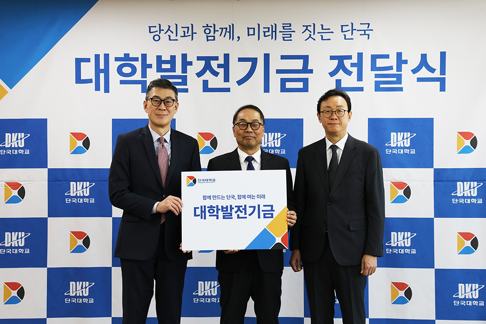 지난 14일(수) 죽전캠퍼스 범정관에서 불교학생회 동문회와 경제학과장학회의 대학발전기금 전달식이 연이어 개최됐다. 이번 전달식은 동문들의 지속적인 나눔을 통해 대학 발전과 후배 양성을 응원하는 뜻을 함께 나누는 자리로 마련됐다. △ 불교학생회 동문회 발전기금 전달식 단체사진(왼쪽부터 김재일 대외부총장, 우상진 운영위원, 신은종 대외협력처장)