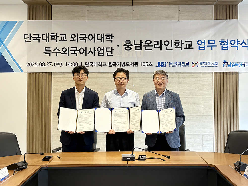 특수외국어사업단(단장 백용훈)이 지난 8월 27일(수) 충남온라인학교(교장 이영주), 외국어대학(학장 장호득)과 함께 외국어 분야 인재 양성과 교육 발전을 위한 다자간 업무협약을 체결했다. ▲(왼쪽부터)특수외국어사업단 백용훈 단장, 충남온라인학교 이영주 교장, 외국어대학 장호득 학장이 협약 기념사진을 촬영했다. 이번 협약을 통해 각 기관은 ▲고교학점제에 맞춘 특수외국어 강좌 공동 운영 ▲온·오프라인 융합 교육과정 개발▲진로 탐색 및 전공 체험 제공 ▲콘텐츠 및 인프라 공유 ▲지역사회 연계 교육 프로그램 등을 함께 추진하게 된다. 충남온라인학교는 충청남도 내 고등학생들을 대상으로 한 실시간 쌍방향 원격수업 시스템을 운영하고 있으며, 학교별로 개설하기 어려운 다양한 과목을 학생들에게 제공하고 있다. 이번 협약을 통해 충남온라인학교 플랫폼과 우리 대학의 외국어 전문 교육 역량이 결합해 시너지를 낼 것으로 기대한다. 백용훈 단장은 “이번 협약이 고교학점제와 지역사회 기여를 아우르는 교육 혁신 모델로 자리매김하길 기대하며, 특수외국어에 관심이 있는 충남 지역 고등학생들에게 실질적으로 도움이 되는 수업을 제공할 수 있도록 노력하겠다”고 밝혔다. 한편 우리 대학은 지난 2017년 교육부 국립국제교육원 ‘특수외국어교육 진흥사업’ 전문교육기관으로 지정돼 국내외 연수, 번역 프로젝트, 경시대회, 탄뎀(언어학습 어플리케이션)·튜터링 등 다양한 비교과 프로그램을 통해 학생들의 언어 및 글로벌 역량을 체계적으로 키우고 있다. #단국대 #특수외국어사업단 [대학뉴스 제보] 죽전 홍보팀 : 031-8005-2032~5, 천안 홍보팀 : 041-550-1061