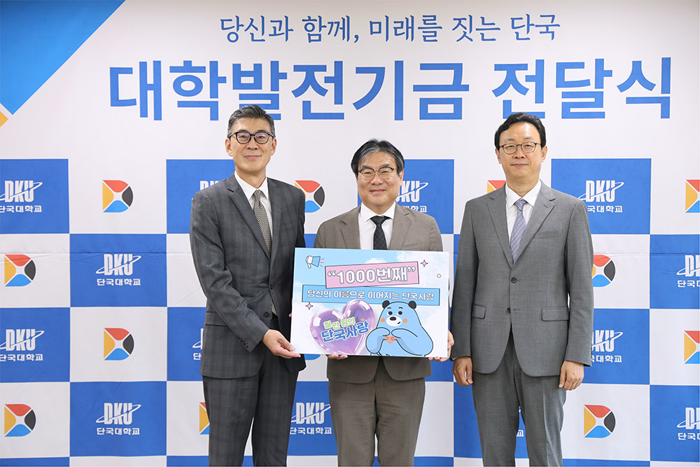 소액 기부 캠페인 「월 만원의 단국사랑」 1년 6개월 만에 1천 명 참여…단국 인재 양성 든든한 기반 마련 법학과 최호진 교수, 1천 번째 기부 주인공…‘우리는 모두 단국 가족’ 우리 대학 소액 기부 캠페인 「월 만원의 단국사랑」 이 기부자 1천 명을 돌파했다. 뜻깊은 1천 번째 기부 주인공은 법학과 최호진 교수(대학원 교학처장) 다. ▲ 「월 만원의 단국사랑」 1천 번째 기부자 달성 기념식(왼쪽부터 김재일 대외부총장, 최호진 대학원 교학처장, 신은종 대외협력처장) 「월 만원의 단국사랑」은 대외협력처가 기획해 2024년 3월 안순철 총장 취임과 함께 시작된 소액 기부 캠페인이다. 이 캠페인은 1년 6개월 만에 1천 명의 기부자가 참여하며 단국 인재 양성의 든든한 기반을 마련했다. 이를 기념하는 행사가 지난 2일(화) 죽전캠퍼스에서 열렸으며, 김재일 대외부총장, 신은종 대외협력처장, 최호진 교수 등이 참석했다. 최 교수 가족은 ‘진정한 단국 가족’으로 불린다. 장녀 지원 양은 보건행정학과(20학번) 졸업한 뒤 현재 의과대학 조교로 재직 중이며, 차남 원준 군은 신소재공학과(24학번)에 수석으로 입학해 학업에 매진하고 있다. ▲ 우리 대학 보건행정학과를 졸업한 장녀 지원 양의 봄 학위수여식 가족 사진. 최 교수는 “사랑하는 두 아이의 학업과 성장을 든든히 뒷받침해 준 단국대에 늘 감사하다”라며 “우리 부부는 자녀들이 받은 사랑을 단국인에게 돌려줘야겠다고 생각해 ‘작지만 강한 기부’에 동참하게 됐다”라고 소감을 밝혔다. 김재일 대외부총장은 “단국을 사랑하는 구성원의 ‘월 1만 원’은 대학의 새로운 도약을 이루는 큰 물결이 될 것”이라며 “개교 80주년을 맞는 2027년까지 2만 명 동참(월 2억 원, 연간 24억 원)을 달성해 하나 된 단국인의 힘을 보여주자”라고 강조했다. 우리 대학은 기부 문화 확산을 위해 「월 만원의 단국사랑」 을 비롯해 「후원의 집」, 「캠퍼스 벤치 네이밍」, 「단국사랑 골프대회」 등 다양한 프로그램을 운영하고 있다. 특히 「캠퍼스 벤치 네이밍」은 재학생 휴식 공간과 기부 문화 확산이라는 두 마리 토끼를 잡으며 국내 대학의 모범 사례로 기록되기도 했다. ▲ 오는 9월 죽전캠퍼스에서 실시하는「2025 홈커밍 캠퍼스 걷기」 행사 포스터. 대외협력처는 동문 간 네트워크 형성과 기부 문화 확산을 위해 홈커밍 캠퍼스 걷기 대회를 기획했다. 오는 9월 20일(토)에는 동문‧교직원‧재학생이 함께하는 「2025 홈커밍 캠퍼스 걷기」 행사도 열릴 예정이다. 안순철 총장은 “우리 대학의 큰 성장 동력은 단국을 사랑하는 동문과 구성원, 독지가들의 아름다운 동행에서 비롯된다”라며 “26만 단국인 네트워크를 적극적으로 가동해 혁신과 도약의 발판을 마련하겠다”고 밝혔다.