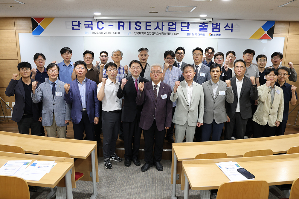 우리 대학이 충청남도의 미래 신성장 산업을 함께 선도할 ‘단국 C-RISE 사업단’을 공식 출범시키고 지역 산업 기반 맞춤형 인재 양성에 박차를 가한다. △출범식 기념사진 출범식은 지난달 28일 천안캠퍼스 산학협력관에서 열렸으며 백동헌 천안부총장, 이재원 산학협력단장, 김주덕 천안시 스마트도시추진단장, 대학 및 천안시청 관계자 등 50여 명이 참석했다. 단국 C-RISE 사업단은 충남 라이즈 사업을 통해 2025년부터 5년간 총 348억 5천만 원을 지원받으며 ‘지역취업 보장형 계약학과 운영’, ‘기초지자체 협약 기반 지역현안 해결’ 등 총 10개 세부 과제를 수행한다. 특히 도내 8개 대학, 교원 42명과 함께 충남형 대학혁신체계(공유대학) 구축하고 인재·대학·산업·지역이 하나로 연결되는 지속가능한 성장의 선순환 구조를 만들어 나갈 계획이다. △(왼쪽부터)김주덕 천안시 스마트도시추진단장,이재원 산학협력단장, 백동헌 천안부총장, 이일석 학생처장, 윤종원 과학기술대학장, 신영재 입학처장이 단국C-RISE사업단의 출범을 기념하며 현판식을 가졌다. 백동헌 천안부총장은 “단국대가 미래형 지역혁신의 대표 모델로 자리매김하길 기대한다”며 “지역사회와 함께 성장해 온 대학으로 이번 라이즈사업을 통해 충남의 지속 가능한 혁신 생태계를 선도해 나가겠다”고 했다. 한편, 라이즈(RISE) 사업은 교육부, 지자체, 대학이 협력하여 지역 발전을 견인하는 새로운 대학지원 체계다. 우리 대학은 천안캠퍼스를 중심으로 한 충청남도 RISE 사업과 죽전캠퍼스를 중심으로 한 경기도 RISE 사업에 모두 선정되어, 지역 특성에 맞춘 혁신 인재 양성과 지속 가능한 지역 발전을 이끌고 있다. #단국대 #지역혁신중심대학지원체계 #RISE #라이즈 [대학뉴스 제보] 죽전 홍보팀 : 031-8005-2032~5, 천안 홍보팀 : 041-550-1061