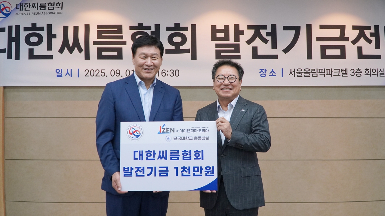 26만 단국인의 자긍심을 고취시키고 활력있는 동문 사회 만들기에 앞장서고 있는 고정용 총동창회장(경제학과 77학번, ㈜아이젠파마코리아 대표)이 대한씨름협회에 발전기금 1천만 원을 기탁했다. ▲고정용 총동창회장(오른쪽)이 이준희 대한씨름협회 회장에게 발전기금을 전달하고 기념촬영을 했다. 이번 발전기금은 고정용 회장이 대표로 있는 ㈜아이젠파마코리아에서 출연한 기금으로, 체육교육과 76학번 동문인 이준희 대한씨름협회 회장에게 전달돼 동문 간 협력과 우정을 더욱 돈독히 했다. 전달식은 지난 1일(월) 대한씨름협회에서 열렸으며 고정용 회장, 이준희 회장, 박지원 동문(국회의원, 총동창회 고문), 김재일 대외부총장, 총동창회 임원진이 함께해 자리를 빛냈다. 이준희 회장은 “차세대 천하장사 육성을 위해 노력하는 대한씨름협회에 깊은 애정과 지원을 보내주신 고정용 총동창회장님과 ㈜아이젠파마코리아에 진심으로 감사드린다” 라고 밝혔다. ▲대한씨름협회 발전기금 전달식에 참여한 참석자 단체 사진 고정용 회장은 “씨름은 우리 민족의 전통 스포츠이자 문화 자산으로 반드시 계승·발전시켜야 한다”라며 “앞으로도 총동창회는 모교와 동문, 동문과 동문을 이어주는 든든한 가교가 되고 모교가 명문 사학으로 우뚝 설 수 있도록 든든한 버팀목이 되겠다”라고 밝혔다. 김재일 대외부총장은 “이번 기탁은 동문 기업의 나눔, 동문 인사의 참여, 모교의 관심이 어우러지며 단국인의 돈독한 유대감을 확인한 자리”라며 “한결같이 모교와 동문 사랑을 실천해 주시는 고정용 총동창회장님의 고귀한 뜻에 감사드린다”고 밝혔다.