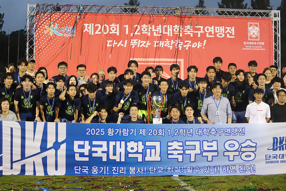 우리 대학 축구부(감독 박종관)가 제20회 1·2학년 대학축구연맹전 황가람기에서 창단 이래 첫 우승을 차지하며 지난달 추계대학축구연맹전 백두대간기에 이어 2관왕을 달성했다. △ 우승을 차지한 축구부가 기념촬영을 했다. 지난 8월 31일 경남 합천공설운동장에서 열린 결승전에서 우리 대학은 광주대학교를 상대로 2-0 승리를 거뒀다. 전반 15분 주장 조민서가 중거리 슈팅으로 선제골을 기록했고 후반 19분 교체 투입된 이윤성이 추가골을 터뜨리며 승부에 쐐기를 박았다. 앞서 우리 대학은 조별예선에서 △세경대(1-0) △김천대(2-0) △우석대(5-2)를 차례로 꺾으며 조 1위로 본선에 올랐다. 본선에서는 △장안대(16강, 2-1) △홍익대(8강, 승부차기 7-6) △구미대(4강, 2-0)를 차례로 제압하며 결승 무대에 올랐다. 특히 홍익대와의 8강전에서는 0-0 무승부 이후 승부차기 접전 끝에 승리하며 팀의 뚝심을 보여줬다. △ 주장 조민서가 선제골을 기록한 뒤 기뻐하고 있다. 이번 대회는 악천후 속에서도 치러졌으나 선수들은 조직적인 압박과 정교한 패스로 경기 흐름을 장악하며 안정적인 경기력을 선보였다. 광주대의 거센 반격에도 골키퍼 강태웅의 선방과 견고한 수비가 빛을 발하며 무실점 승리를 완성했다. △ 추가골을 기록한 이윤성이 환호하는 장면. 특히 이번 대회에서 우리 대학은 △강태웅(김병지 GK상) △김민준(홍명보 수비상) △주장 조민서(최우수선수상) △박종관 감독, 이성우 코치(최우수지도자상)에 선정되어 주요 개인상을 대거 휩쓸며 기량을 입증했다. 조민서 주장(국제스포츠학부 2학년)은 “황가람기 첫 우승을 우리 손으로 만들어내 정말 감격스럽다”며 “결승전뿐 아니라 조별예선부터 끝까지 집중력을 잃지 않고 함께 싸워준 동료들에게 고맙다. 앞으로도 단국대의 이름을 걸고 더 큰 무대에서도 당당히 맞서겠다”고 소감을 전했다. △ 우승을 이끈 박종관 감독이 최우수지도자상을 수상했다. 박종관 감독은 “황가람기 첫 우승이라는 값진 성과를 이룰 수 있어 매우 기쁘다”며 “지난달 추계대회 우승에 이어 다시 한번 정상에 설 수 있었던 것은 끝까지 최선을 다한 선수들과 응원해주신 대학 구성원 덕분”이라며 소감을 전했다. 우리 대학 축구부는 이번 우승으로 △추계대학축구연맹전(2023, 2025) △춘계대학축구연맹전(2023) △U리그 왕중왕전(2022) 등과 함께 황가람기 첫 우승을 추가하며 대학 축구 강호로서의 위상을 다시금 굳건히 했다.