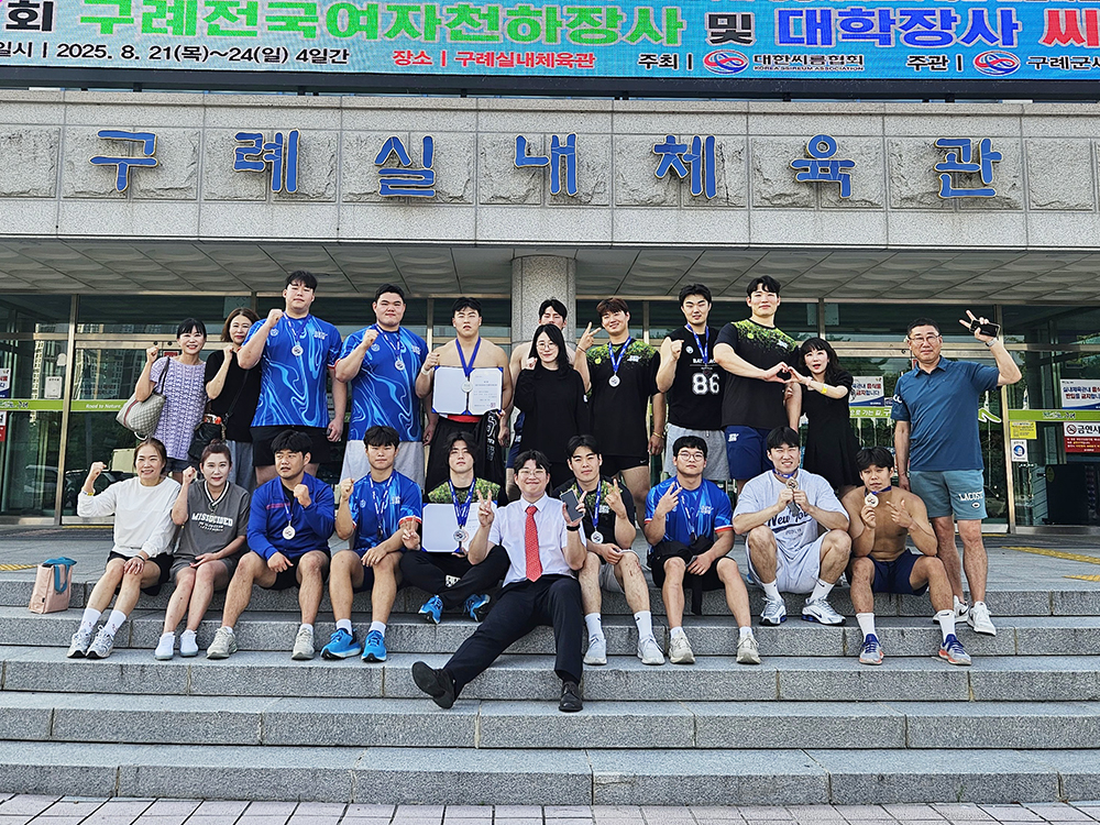 우리 대학 씨름부(감독 주두식)가 지난 8월 20일부터 22일까지 전남 구례군 구례실내체육관에서 열린 「제17회 구례여자천하장사 및 대학장사씨름대회」에서 단체전 준우승을 차지하며 눈부신 활약을 펼쳤다. △준우승을 기념해 단체사진을 촬영했다. 대한씨름협회가 주최하고 구례군이 주관한 이번 대회에 우리 대학은 ▶우석대와의 1회전(4:3 승리) ▶경기대와의 2회전(4:1 승리) ▶대구대와의 준결승 (4:2 승리)를 거두며 결승에 진출했다. 결승전에서는 시즌 3관왕을 노리는 강호 인하대와의 혈투 끝에 3:4로 아쉽게 패하며 준우승에 머물렀지만, 마지막 장사급 경기까지 가는 치열한 승부는 씨름 팬들의 큰 관심을 모았다. 개인전에서는 국제스포츠전공 3학년 강병우 선수가 소장급에서 3위를 기록하며 팀의 명예를 더했다. 주두식 감독은 “이번 대회를 통해 팀워크의 힘을 다시 확인할 수 있었다” 며 “시즌 마지막 천하장사씨름대회에서 더 큰 도전을 이어가겠다”고 포부를 밝혔다. 한편, 우리 대학 씨름부는 올해 제3회 대한체육회장기 전국장사씨름대회와 제2회 괴산유기농배 전국장사씨름대회에서 연달아 단체전 우승을 차지하며 시즌 2관왕에 올랐다. #단국대 #씨름부 #괴산유기농장사배 전국장사씨름대회 #주두식 [대학뉴스 제보] 죽전 홍보팀 : 031-8005-2032~4, 천안 홍보팀 : 041-550-1061