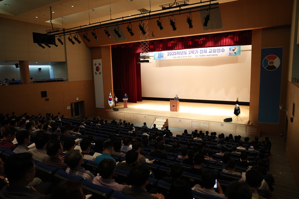 2025-2학기 개강을 맞아 전체 교원연수가 20일(수) 죽전캠퍼스에서 열렸다. 연수에는 700여 명의 교원들이 참석해 자리를 메웠다. △2025-2학기 전체 교원연수가 20일(수) 죽전캠퍼스에서 열렸다. 안순철 총장은 “교육, 연구, 봉사, 학생 지도에 헌신해 주시는 교수님들의 열정은 우리 대학 발전의 가장 중요한 원동력”이라며 인사를 전하고 지난 학기 주요 성과를 공유했다. △안순철 총장이 전체 교원연수에서 인사말을 하고 있다. 안 총장은 ▲교육부 대학 혁신지원사업 2년 연속 S등급 획득 ▲지역혁신중심 대학지원체계(RISE) 사업 선정 ▲산학협력 수주 실적 2년 연속 1천억 원 돌파 ▲'세계 상위 2% 과학자'에 교원 29명 선정 ▲QS 세계대학 평가 순위 상승 ▲전공자율선택제 도입 등을 1학기의 대표적 성과로 꼽았다. 또한 "연구 역량은 우리 대학의 지속가능성과 위상을 결정하는 핵심 지표"라며 질 높은 연구 성과 창출을 위한 연구비 지원 확대와 계열별 특성을 고려한 맞춤형 지원책 마련 계획을 밝혔다. △ 전체 교원연수에서 2025학년도 2학기 신규 임용 교원들이 소개됐다. △김재일 대외부총장(대학평가전략위원장)이 대외 평가 주요 결과를 발표하고 있다. 연수에서는 ▲신규 임용 교원 소개 ▲대외평가 주요 결과(대학평가전략위원회) ▲대학혁신지원사업 성과 및 계획(대학혁신사업단) ▲대학 연구비 안내(교무처) ▲2026학년도 입학전형 안내(입학처) 등이 진행됐다. 안순철 총장은 "창학 100년을 준비해야 하는 중대한 전환기를 맞아 교육, 연구, 인프라, 재정 등 모든 영역에서 혁신을 선도해야 한다"며 "'사람을 키우고 변화를 선도하는 단국'을 함께 만들어가자"고 당부했다. 안순철 총장 교원연수 인사말 바로가기 #단국대 #교원연수 [대학뉴스 제보] 죽전 홍보팀 : 031-8005-2032~5, 천안 홍보팀 : 041-550-1061