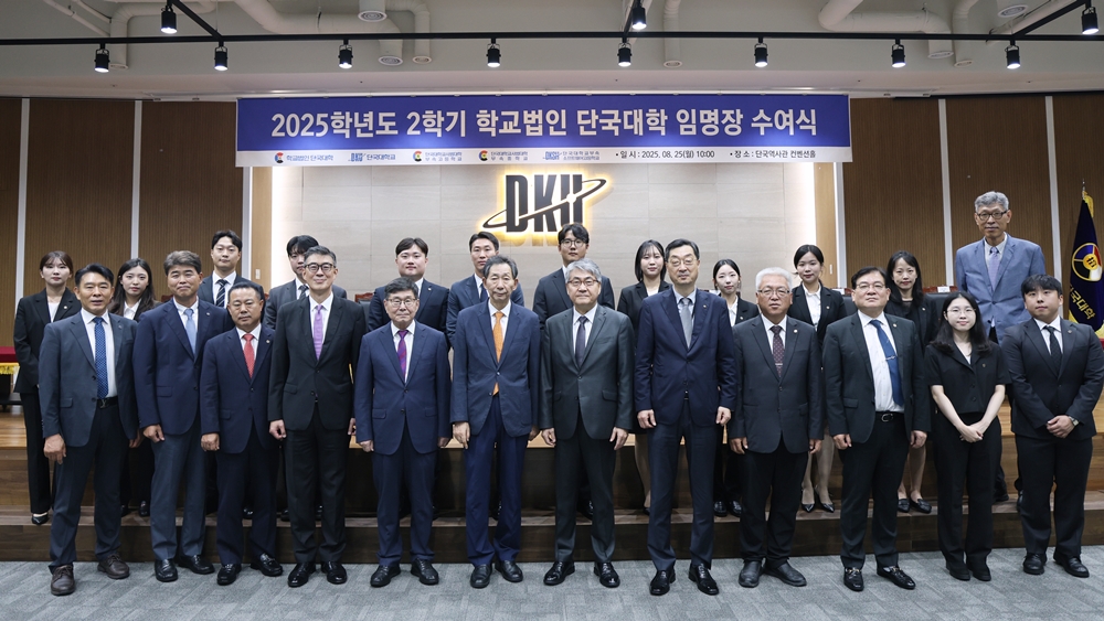 장호성 이사장이 지난 25일(월) 단국역사관 컨벤션홀에서 신규 임용 교직원 및 보직 선임자 57명에게 임명장을 수여하며 대학 발전을 위한 새로운 도약을 다짐했다. 임명장을 받은 교직원은 ▲신규 임용 교원 23명 ▲신규 임용 직원 13명 ▲보직 선임 및 직급 승진자 21명 등 총 57명이다. ▲신임 교직원·보직자 임명장 수여식이 단국역사관 컨벤션홀에서 열렸다. 장호성 이사장은 “대학 발전을 위해 한마음 한뜻으로 교육과 연구 활동에 매진해 달라”며 “단국대만의 교육철학과 가치를 지키고, 나아가 학자와 교육자로서 사회발전에 어떻게 기여할지 늘 고민하며 교육현장에 임해주길 바란다”라고 당부했다. 안순철 총장은 “새롭게 단국 가족의 일원이 된 신규 임용 교직원 여러분께 진심으로 감사와 환영의 뜻을 전한다”라며 “최상의 교육·연구와 행정에 헌신하는 교직원들이야말로 우리 대학의 가장 큰 원동력이다”라고 강조했다. ▲신규 임용 전임교원 기념사진 ▲신규 임용 직원 기념사진 ▲직원 보직 및 직급승진 기념사진 #단국대 #신규임용 #발령장 #수여식 [대학뉴스 제보] 죽전 홍보팀 : 031-8005-2032~5, 천안 홍보팀 : 041-550-1061