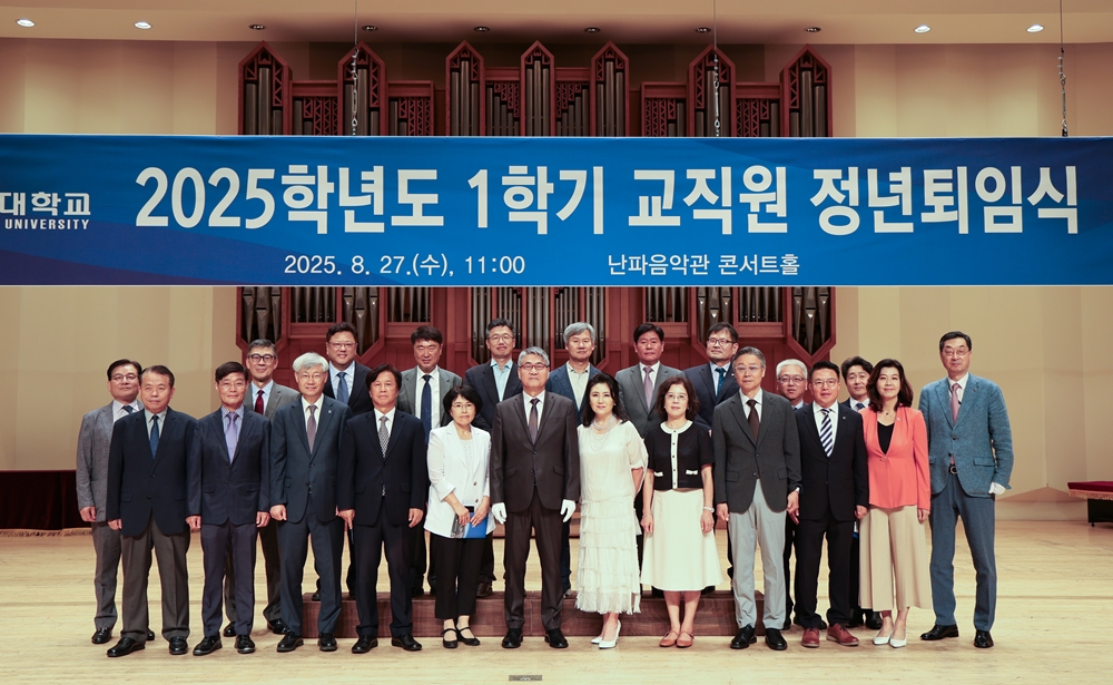 교직원 28명(교원 20명, 직원 8명)이 정든 교정을 떠난다. 27일(수) 죽전캠퍼스 난파음악관 콘서트홀에서 2025학년도 1학기 교직원 정년 퇴임식이 열렸다. △정년퇴임 교직원과 교내 관계자들이 기념촬영을 하고 있다. 퇴임식에는 안순철 총장, 김오영 교학부총장, 백동헌 천안부총장, 김재일 대외부총장, 오좌섭 산학부총장, 이영희 교수회장, 조영식 직원노동조합위원장 등 대학 주요 인사와 퇴임 교직원의 가족, 동료, 제자들이 참석해 퇴임자들의 헌신에 감사의 마음을 전하고 새로운 출발을 축하했다. 안순철 총장은 교육과 연구, 행정 각 분야에서 오랜 시간 대학 발전에 기여한 퇴임 교직원들에게 공로패와 정부포상을 전달하며 감사의 뜻을 전했다. △안순철 총장이 정년퇴임 교직원들에게 공로패와 정부포상을 수여하고 있다. 안 총장은 식사에서 “여러분이 교단과 행정의 일선에서 쌓아온 시간은 곧 우리 대학의 역사이자 단국 정신의 토대”라며 “일구어 오신 전통을 바탕으로 단국 100년을 향한 발걸음을 이어 나가겠다”라고 말했다. △안순철 총장이 정년퇴임 교직원들에게 감사의 인사를 전하고 있다. 정년을 맞이한 정해상 교수(법과대학 법학과)는 “18년의 교직 생활을 돌아보면 신나고, 즐겁고, 보람찬 시간이었다”며 “학생들이 많이 보고, 듣고, 생각하며 대학 생활을 만끽 하기를 바란다”고 소회를 밝혔다. 34년 동안 대학 행정에 몸담아온 안대원 선생(총무처)은 “학령인구감소 등 어려운 여건 속에서도 단국대는 늘 그래왔듯 단국인 정신으로 고난과 역경을 이겨내고 영원히 발전하길 응원하겠다”고 말했다. #단국대 #교직원 #정년퇴임 [대학뉴스 제보] 죽전 홍보팀 : 031-8005-2032~5, 천안 홍보팀 : 041-550-1061